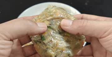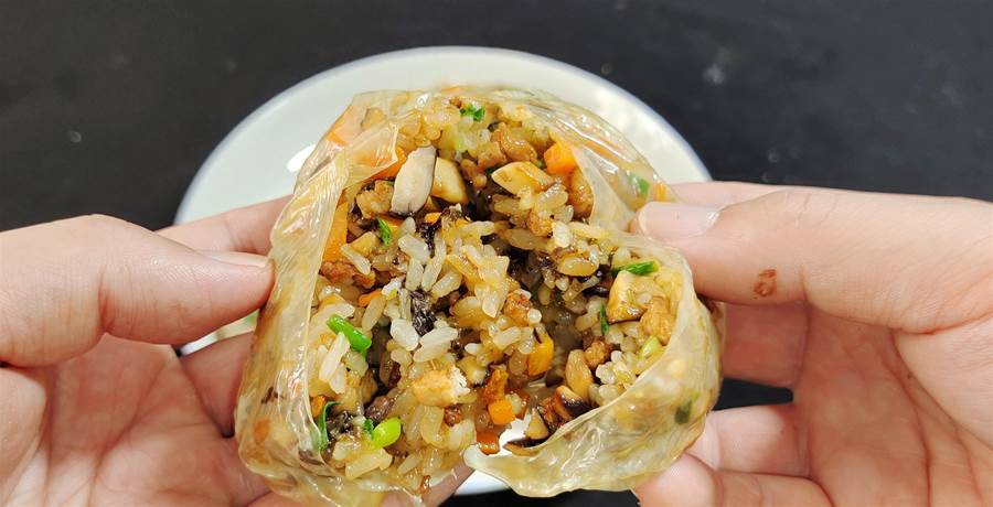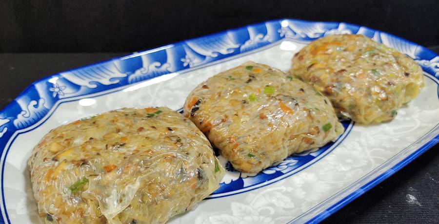 第六步:取一張油豆皮,裁剪成合適大小,取適量炒熟的糯米飯置于其上,下手將其包裹起來,收口要置于下方,而后上蒸鍋大火燒開蒸個5分鐘時間就可以出鍋享用了。蒸熟的豆皮十分有韌性,不要怕破損,咬一口更是咸香軟糯,飽腹又營養,感興趣的不妨試一試。