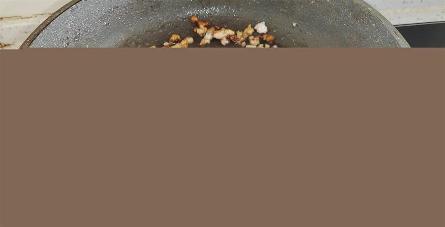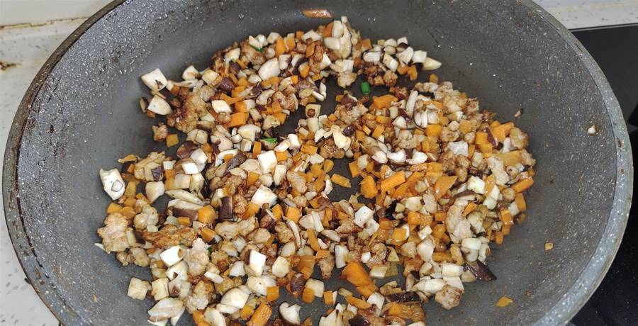 第四步:另起鍋燒油,先把一小塊肉末下鍋煸炒至變色,加入老抽調個色,炒勻后加入香菇丁和胡蘿卜丁一塊翻炒至斷生。