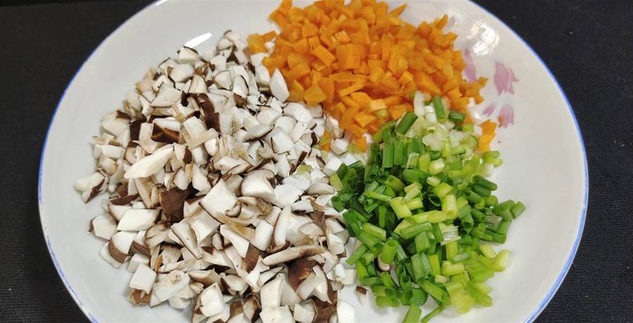 第二步:準備香菇5個左右,切成小顆粒待用,一小塊胡蘿卜也切成小粒待用,再來一把小香蔥切碎待用。