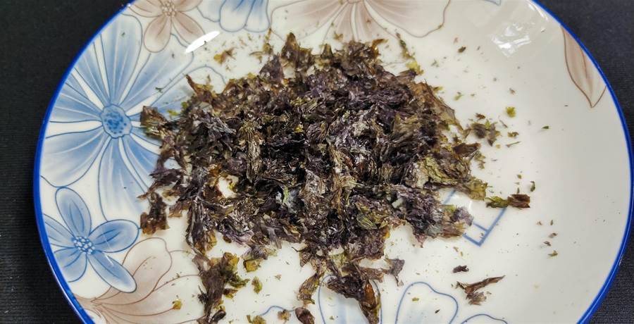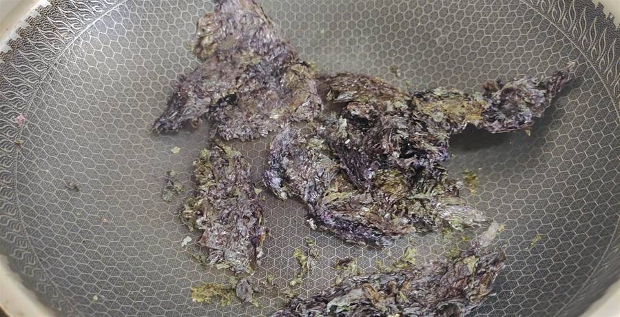 第三步:我們準備一塊燒湯用的紫菜,放入鍋中用小火慢慢地焙至變色變脆,過程中要多多翻動防止燒焦。關火取出后用手捏碎待用。