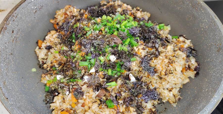 第五步:而后加入蒸熟的糯米飯,淋入生抽,撒入食鹽,保持小火翻炒均勻,顏色不夠的可以再加入少許老抽調色,炒勻后關火后撒入蔥花和紫菜碎拌勻即可出鍋。
