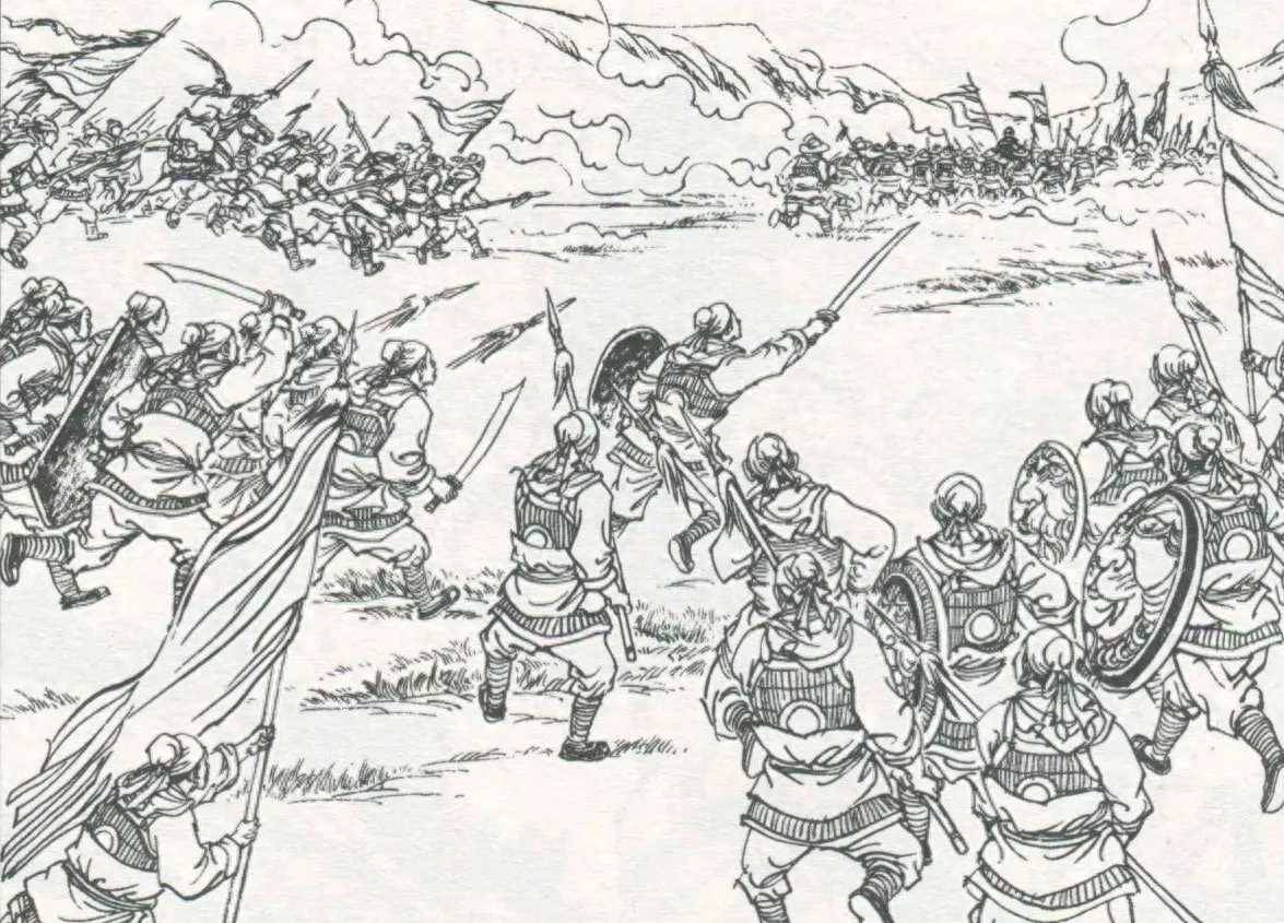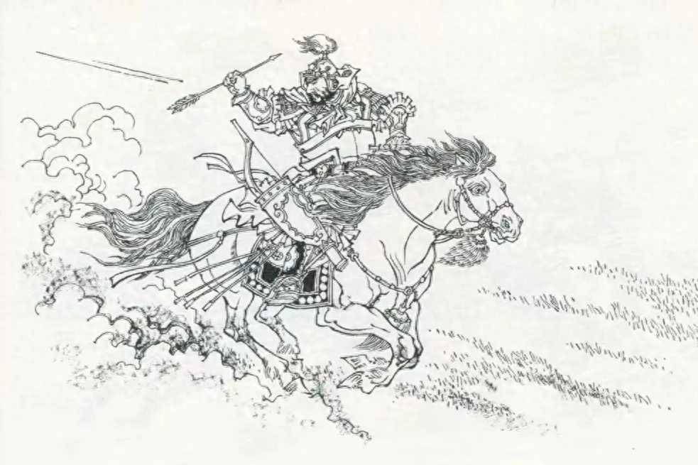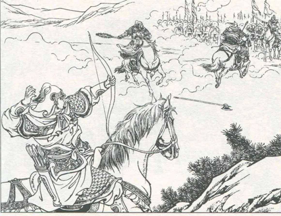 (秦明)輪狼牙棍直奔而來。索超縱馬直取秦明。二匹劣馬相交,兩個急人發憤,眾軍吶喊,斗過二十余合,不分勝敗。前軍隊里轉過韓滔,就馬上拈弓搭箭,覷得索超較親,颼地只一箭,正中索超左臂,撇了大斧,回馬望本陣便走。宋江鞭梢一指,大小三軍一齊卷殺過去。