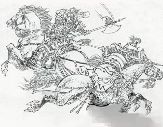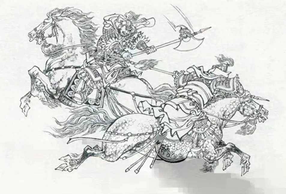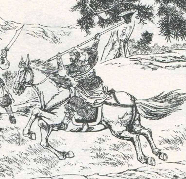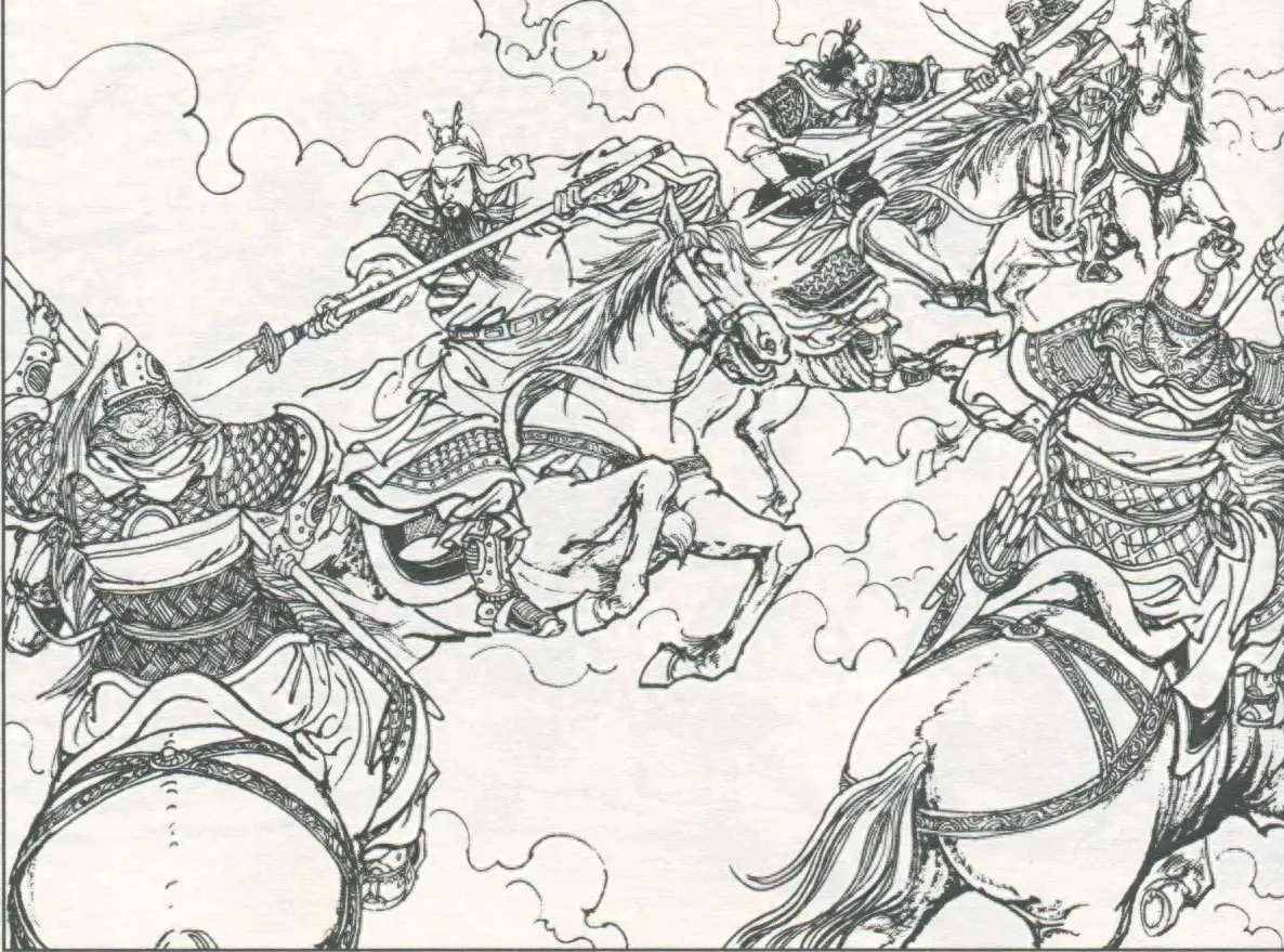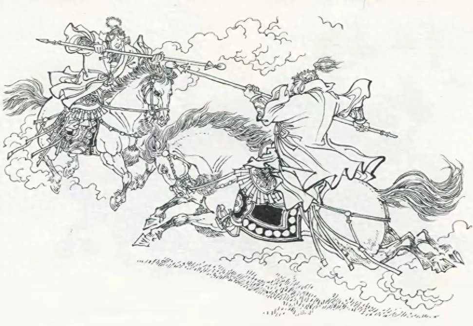 兩馬相交,二般兵器并舉。索超忿怒,輪手中大斧,拍馬來戰楊志;楊志逞威,捻手中神槍來迎索超,二將相交,各賭平生本事。一來一往,一去一回;四條臂縱橫,八支馬蹄撩亂。兩個斗到五十余合,不分勝敗,台上梁中書看得呆了。