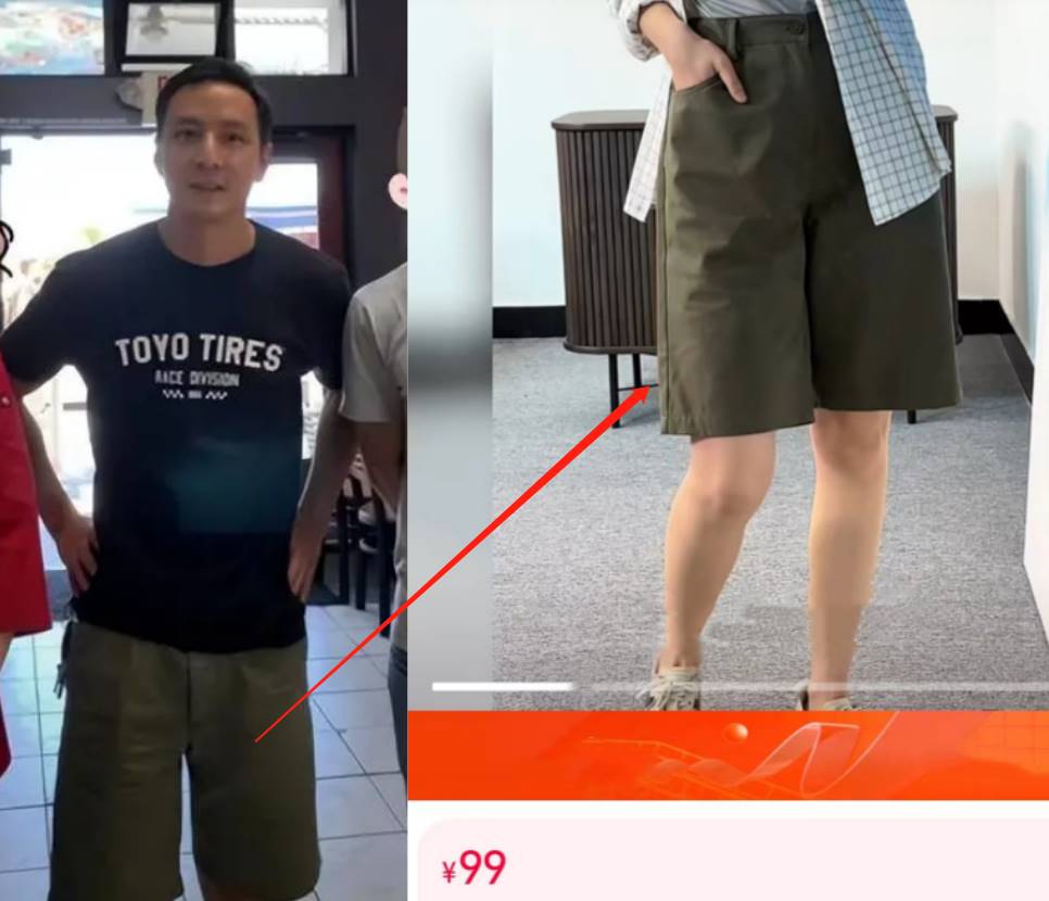 在他身上穿的衣服,也是非常接地气,灰绿色的工装短裤和黑色短袖上衣,在各大平台随便就能买到,也不是什么大品牌,裤子价格是99元一件,和普通人穿的一样。