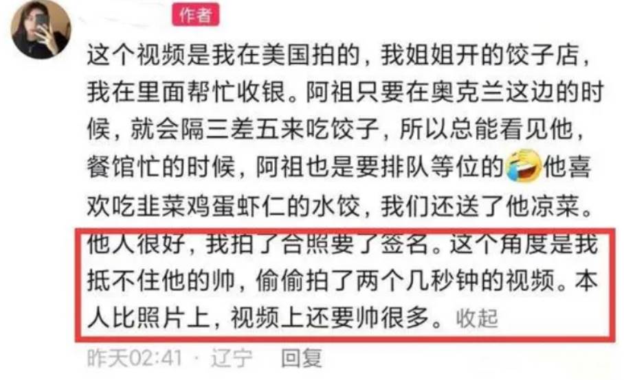 近期,有住在美国的网友晒出吴彦祖近照,透露吴彦祖在她姐姐家开的饺子店里用餐,吴彦祖只要是在奥克兰这边都会隔三差五吃饺子,忙的时候也会和普通顾客一起排队等,他最喜欢吃韭菜鸡蛋虾仁水饺。