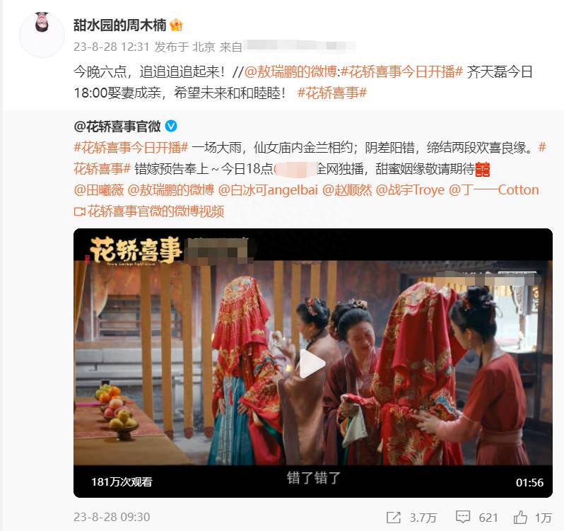 而28號的時候這部劇首播,《少年歌行》的原著作者周木楠也發文祝賀,并且表示「今晚六點,追追追追起來!齊天磊今日18:00娶妻成親,希望未來和和睦睦!」 周木楠和敖瑞鵬之間算是此前有過一次「合作」,那就是電視劇《少年歌行》這部作品,這部劇堪稱是非常火爆的,而這一次周木楠慶賀敖瑞鵬新劇上線,結果卻「慘遭」催更。