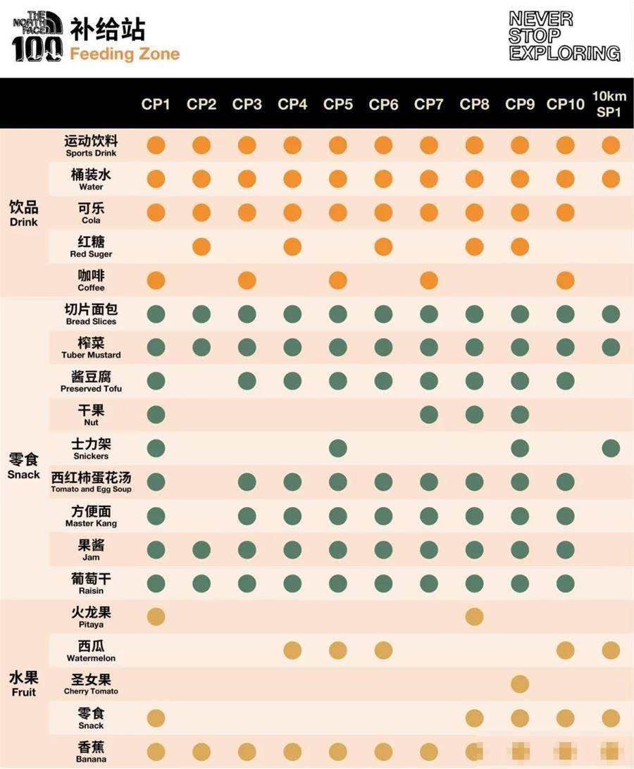 今年TNF100莫干山的「大餐」 常規補給依然多種多樣 清甜又可口的水果 熱氣騰騰的方便面 松軟易消化的面包 補充能量的士力架 五花八門的干果零食 …… 特色補給則再度「擴容」 口感勁道的手工次塢打面 70年只做一種澆頭的交通面 豌豆清香、臘肉醬香的野火飯 外酥里軟噴香撲鼻的烙大餅 …… 常規補給清單 ▼