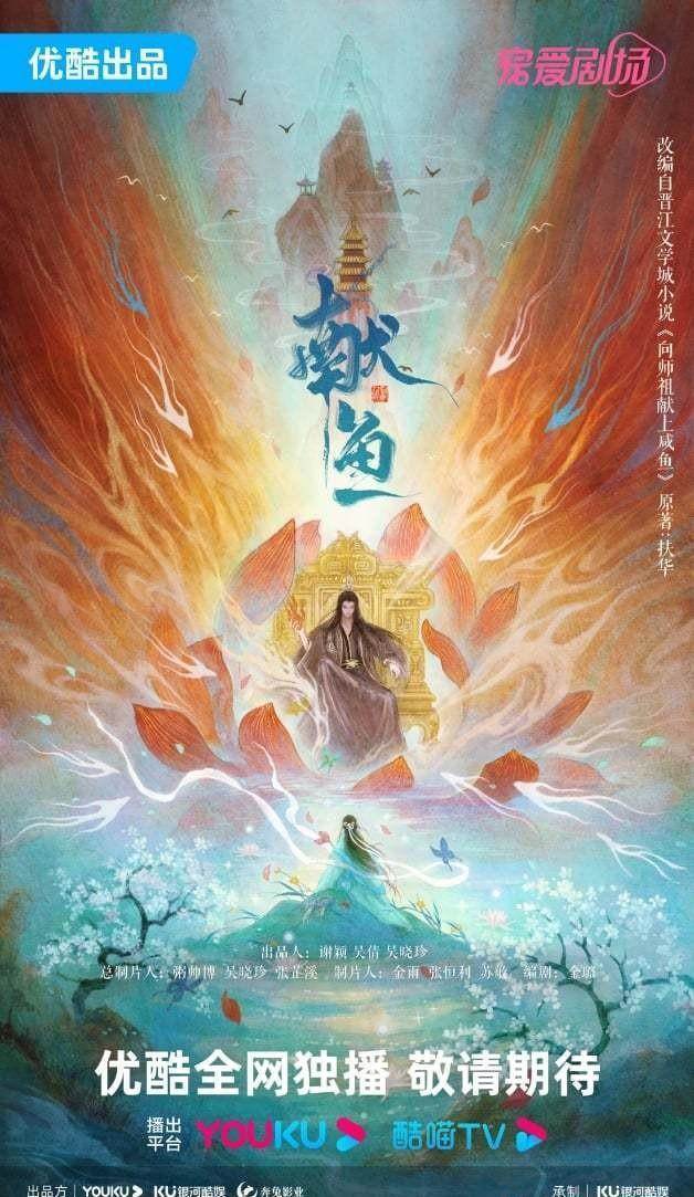 陳飛宇、王影璐主演的《獻魚》,改編自扶華小說《向師祖獻上咸魚》,講述多年前一位高僧曾在庚辰仙府的暴躁師祖「司馬焦」滿是血腥殺戮的未來窺見過一線生機,給他留下一枚佛珠,希望他對生靈有慈心,能將殺心歸藏,後來司馬焦接受「廖停雁」的挑戰,她兩手用力直接扯斷紅線木珠,依靠咸魚的本能降服司馬焦,成為改變他的人, 最終引導大魔頭向善的古裝仙俠故事!