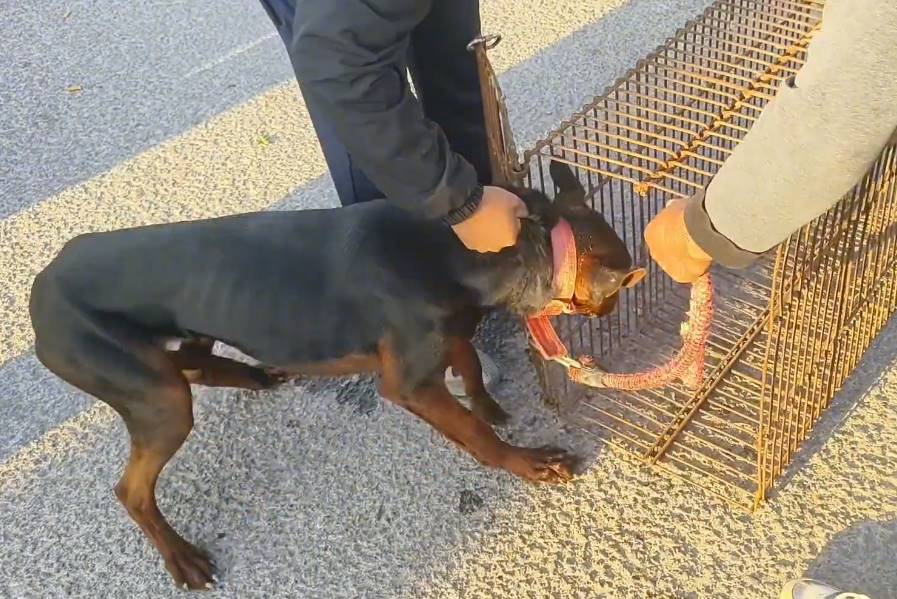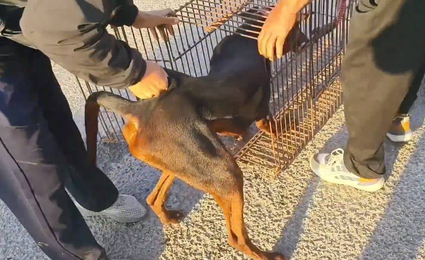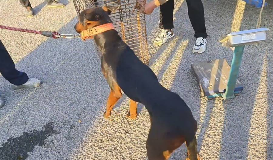 狗主配合狗販子,準備將狗狗裝進狗肉籠