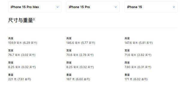 具體重量方面,iPhone 15 Pro Max重221g,機身高度、寬度、厚度分別為159.9mm×76.7mm×8.25mm;iPhone 15 Pro重187g,機身三圍尺寸分別為146.6mm×70.6mm×8.25mm。