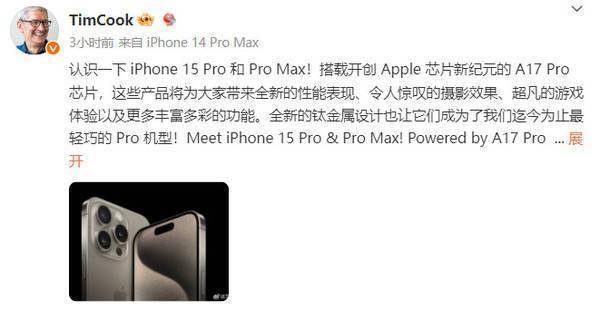 9月13日,庫克發微博推薦了iPhone 15 Pro系列:認識一下iPhone 15 Pro和Pro Max!搭載開創Apple芯片新紀元的A17 Pro芯片,這些產品將為大家帶來全新的性能表現、令人驚嘆的攝影效果、超凡的游戲體驗以及更多豐富多彩的功能。