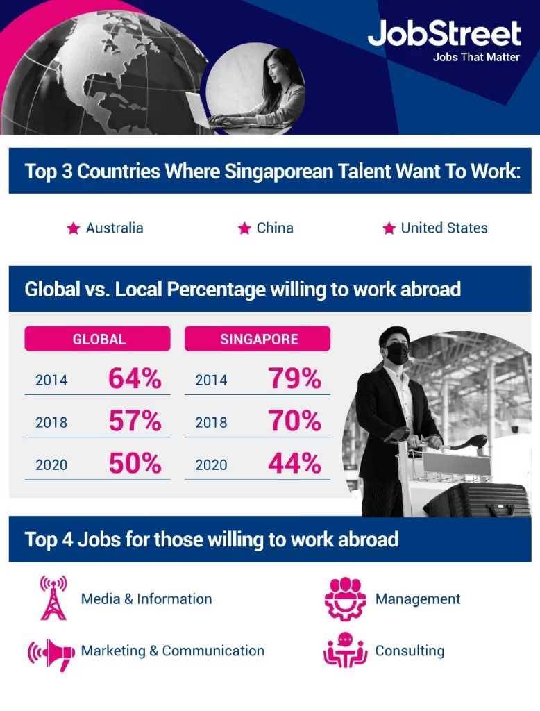 近年来,随着全球化的加速发展,许多新加坡的专业人士开始寻求海外的工作机会。根据JobStreet的数据,新加坡人才最向往的三个工作国家是澳大利亚、中国和美国。这些国家都提供了丰富的工作机会、高水平的生活品质和与新加坡相似的工作环境。然而,从2014年到2020年,愿意在海外工作的新加坡人才比例从64%下降到50%,而只想在新加坡工作的人才比例则从79%下降到44%。
