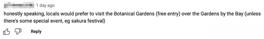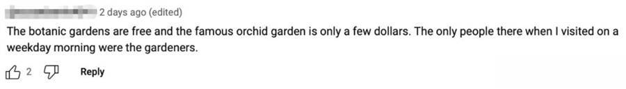 在視訊底下的評論中,網友們對兩人的旅程提出了更劃算的替代方案。比如參觀免費的植物園和屢獲殊榮的國家蘭花園(每張門票10新元),而不是濱海灣花園。