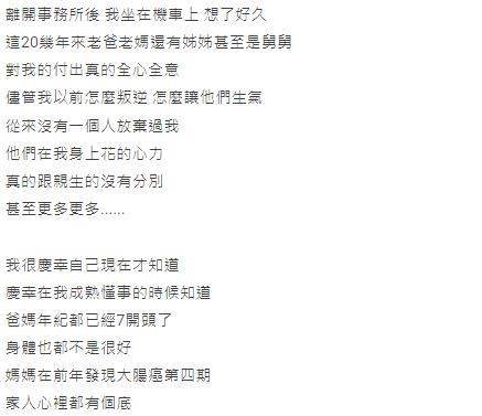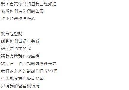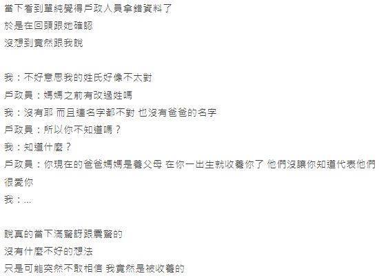 突然得知自己是被收養來的,原PO震驚到離開戶政事務所後,一個人坐在機車上發呆許久。他忍不住感慨,「這20幾年來老爸老媽,還有姊姊,甚至是舅舅,對我的付出真的全心全意,儘管我以前怎麼叛逆,怎麼讓他們生氣,從來沒有放棄過我,他們在我身上花的心力,真的跟親生的沒有分別,甚至更多……」不過考慮爸媽年事已高,媽媽又被發現罹患大腸癌第四期,他心想爸媽隱瞞多年一定有什麼苦衷,他也決定不讓家人知道他已經知曉真相。