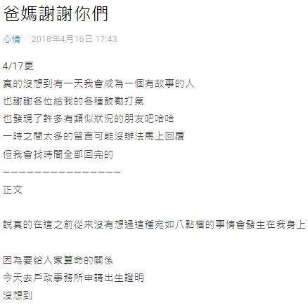 一名男大生在網路論壇Dcard上發文表示,他因為想算命卻不知道自己出生資訊,于是就到戶政事務所申請出生證明,拿到資料後卻發現自己的姓氏和母親姓名都不對,甚至連父親姓名都沒有。戶政人員這才告訴他「所以你不知道?你現在的爸爸媽媽是養父母,在你一出生就收養你了,他們沒讓你知道代表他們很愛你」。