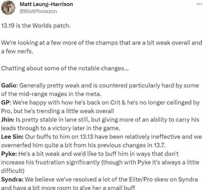 距離LOL全球總決賽到來,還有20天左右的時間,從13.17版本開始,設計師就針對比賽對版本進行了調整,在9月19日,拳頭公布了13.19版本的改動名單,作為世界賽版本,設計師加強和削弱的英雄,全部都是賽場型英雄。