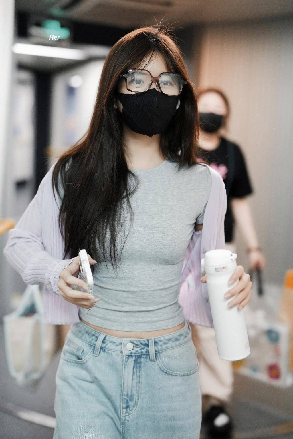 雖然是簡單的配色,灰色的T恤,修身的恰到好處,讓腰部的線條更加纖細,有一種盈盈一握的感覺,細腰美女既視感!