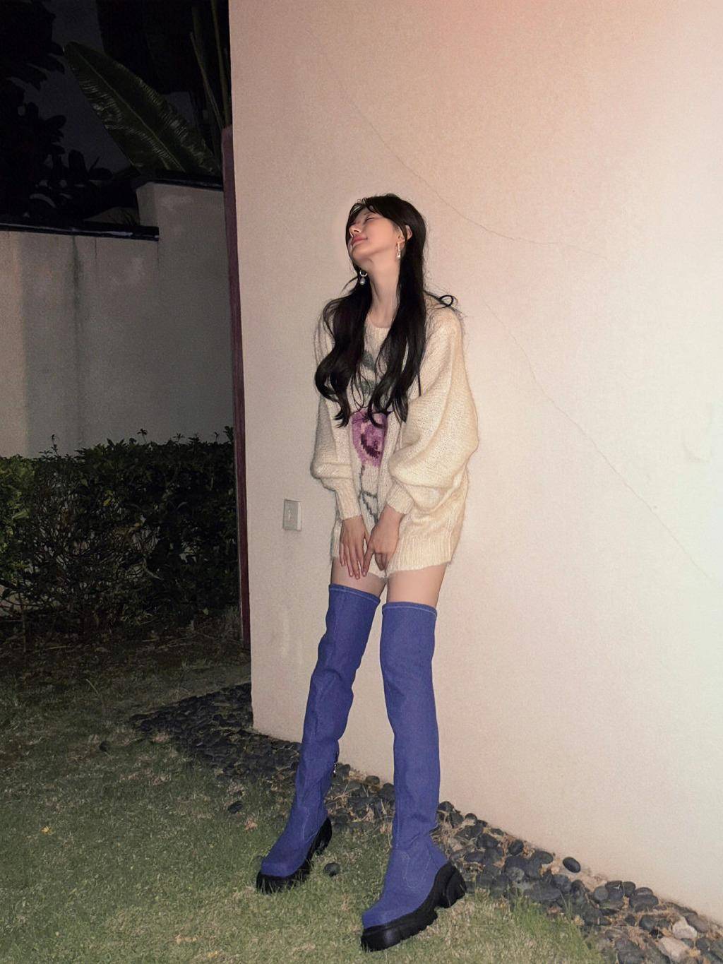 藍色過膝長靴,色彩靚麗,給整套穿搭注入了活力