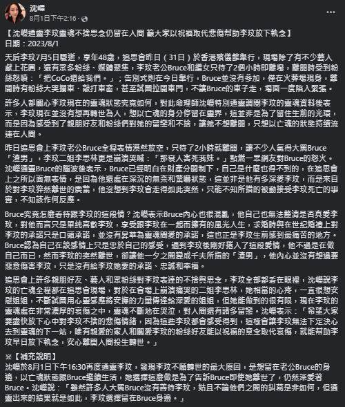 至於有些人好奇,Bruce对於李玟的感情到底是怎样?沈嵘则表示,自己观察来看,Bruce对於李玟是真心喜欢,但没有到灵魂伴侣的程度,在婚礼上的承诺也只是口头上的而已,並没有那么重视,连他自己也无法釐清是不是「真爱李玟」,只是喜欢两人一起相处、一起拥有的人生风光,如今老婆死了,他突然成为千夫所指的渣男,心裡也很纳闷,自己只是一直在「做自己」,只是这些事情,包括在灵堂上,看到姊姊们撕心裂肺,都让李玟很难过,虽然希望透过心灵感应安抚姊姊们,但是能做的有限,因此灵魂一直在哭泣,希望大家还是可以开始祝福李玟,让她不要再如此执着。