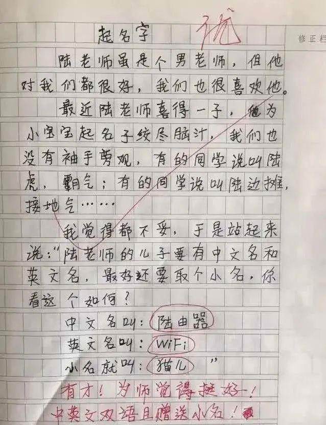 不知道是不是真的有這位「陸老師」,不過從孩子的作文中能看出來他們和老師的關系應該很好,這才能毫無顧忌的給陸老師的孩子「起名字」。