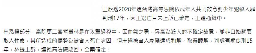 2020年王欣逸因成年人共同故意對少年犯殺人罪,被判刑17年。