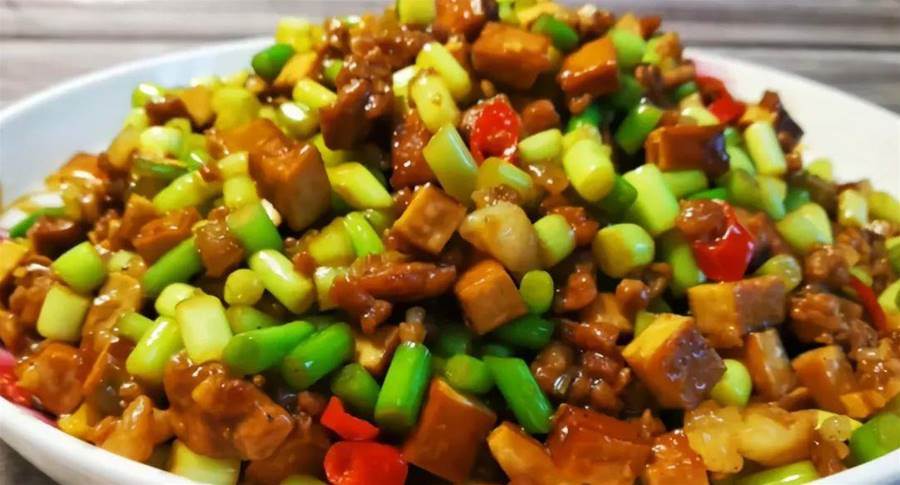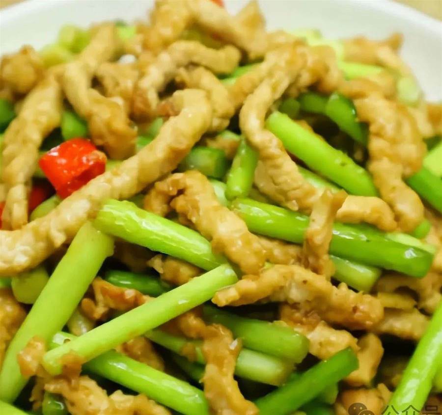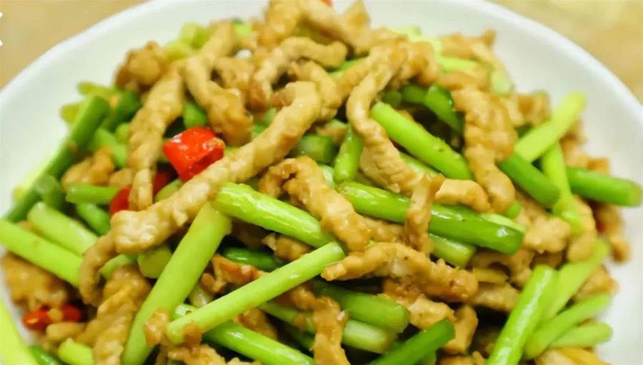 食材:蒜苔、瘦肉、香干、小米椒、大蒜生姜、小蔥