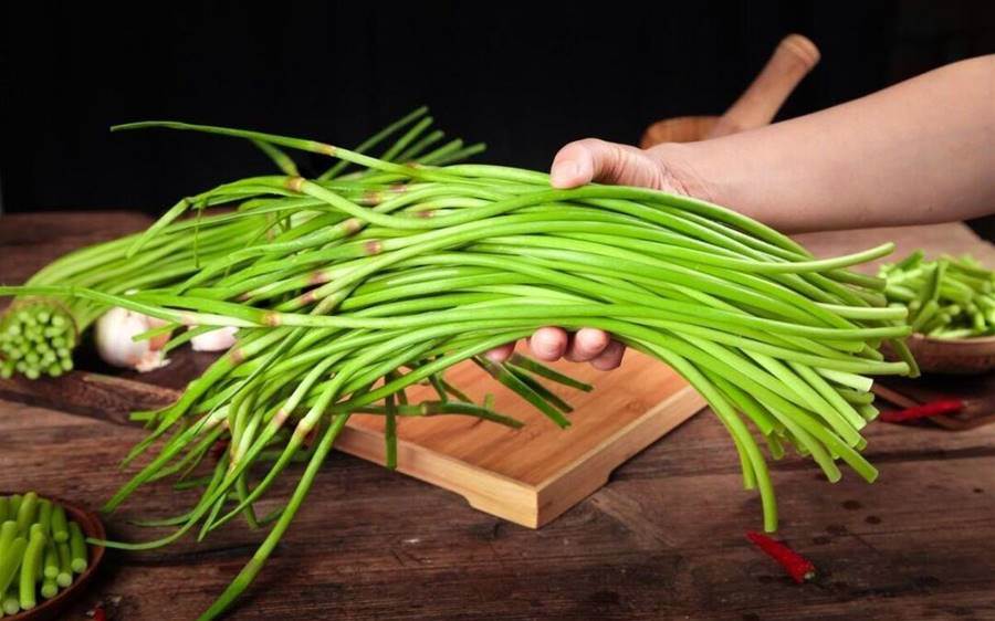 1、蒜苔用流水沖洗干凈,平鋪在一個大一點的筐子里,把表面的水分完全晾干,頭部的一點還有尾部去掉,再切成大約30厘米的長段。