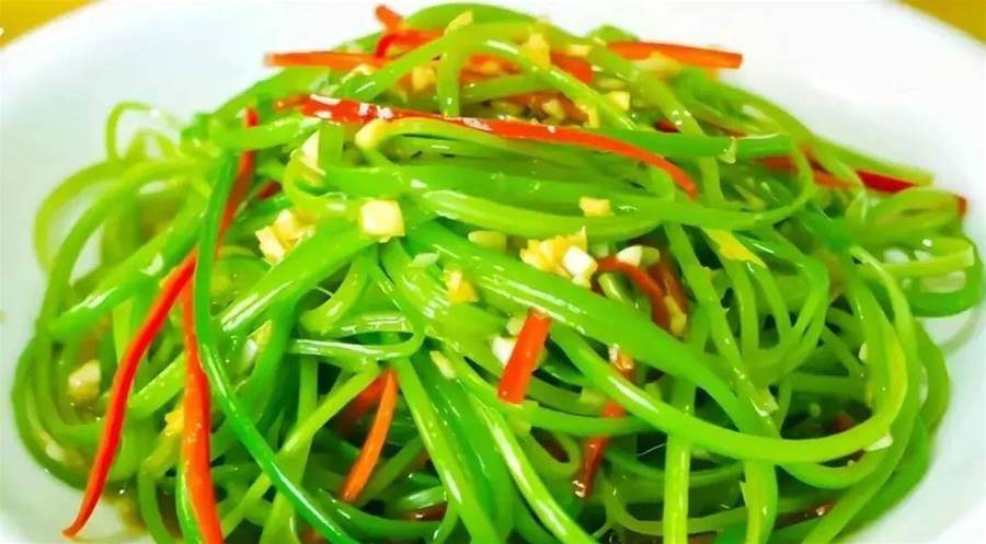 掰掉上面的蒜頭。然后把蒜苔洗干凈,鍋內加入清水,放入一小勺堿面,加堿面煮出來的蒜苔更加脆嫩。水燒開以后放入蒜苔,大火煮一分鐘,蒜苔斷生變軟以后撈出來。迅速放入涼水中過涼。