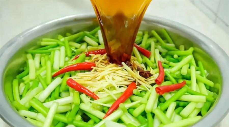 食材:蒜苔、小米椒、生姜、花椒、冰糖、八角、陳醋、白酒、生抽