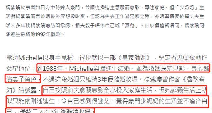 出生于馬來西亞的楊紫瓊曾經在港台娛樂圈發展,因為一場誤會,匆匆嫁入中國香港豪門,只是她人生中第一場婚姻僅僅維持了3年,因為富豪丈夫一心想讓她息影,乖乖做豪門媳婦相夫教子,楊紫瓊無法接受完全依附男方的生活方式,最終選擇了失婚。