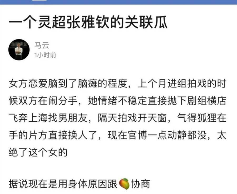 不久之后,有自稱知情的網友出面稱,兩人正在鬧分手,但張雅欽疑似「戀愛腦」,不顧工作飛去求復合,還導致丟了工作。