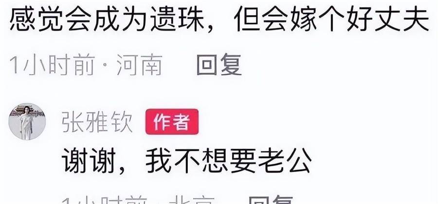 一次,有網友在她的社交平台下留言,直言覺得她「會成為遺珠,但會嫁個好丈夫」,張雅欽馬上「回懟」:「謝謝,我不想要老公。」