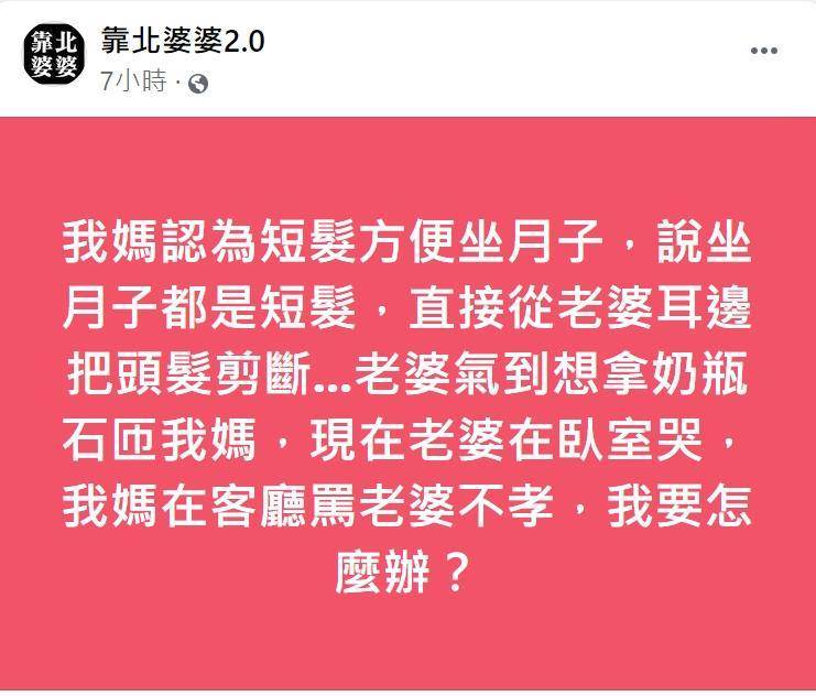 據《TVBS》報導,有網友在臉書社團「靠北婆婆2.0」發文,老婆生完正在坐月子,全家都幫忙照料,媽媽更是貼心想幫媳婦做月子,不過因為長輩的觀念不一樣,媽媽覺得女生坐月子、剪短髮比較方便,但是老婆已經留了很多年,長度超過腰部,對于頭髮非常寶貝,聽到要把頭髮剪掉,心裡當然是萬分不願意。