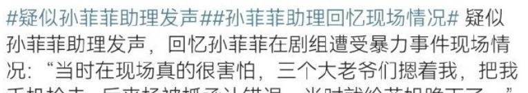 孫菲菲的助理隨后也出來回應,當時她在現場想打電話求救,但被三個大男人坐在身上。