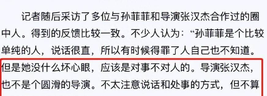 圈內人也是模棱兩可的態度,一方面說孫菲菲性子直容易得罪人,一方面說導演張漢杰不算個脾氣火爆的人。
