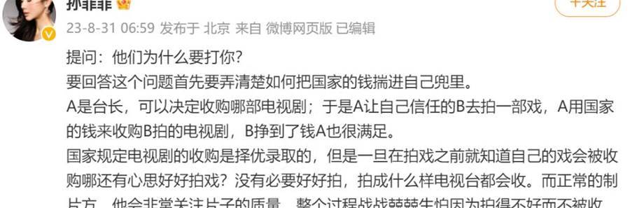 而在孫菲菲最新的發文里也解釋了為什麼會受到霸凌,她也同時揭開了劇組和電視台丑陋的一面,那就是一個行規,電視台提前決定了要收購的劇集,直接安排給信任的導演和劇組制作,那電視劇的質量就變得不是最重要的。