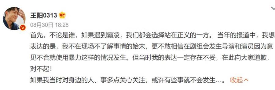 王陽的說辭雖不明顯站隊,但看得出來維護導演。這次孫菲菲舊事重提,王陽也因不堪輿論壓力再次回應,自己當年的表達一定存在不妥,并表示歉意,還說自己一定是站在正義一方,但卻沒有明確表示支持孫菲菲。