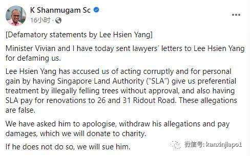 新加坡内政兼律政部长尚穆根在脸书上贴文称,李显扬指责他和维文“贪赃枉法、以权谋私,让新加坡土地管理局(SLA)给我们优惠待遇,未经批准非法砍伐树木,还让土地管理局支付莱道路26号和31号的翻新费用”。