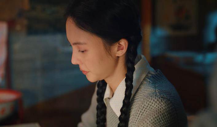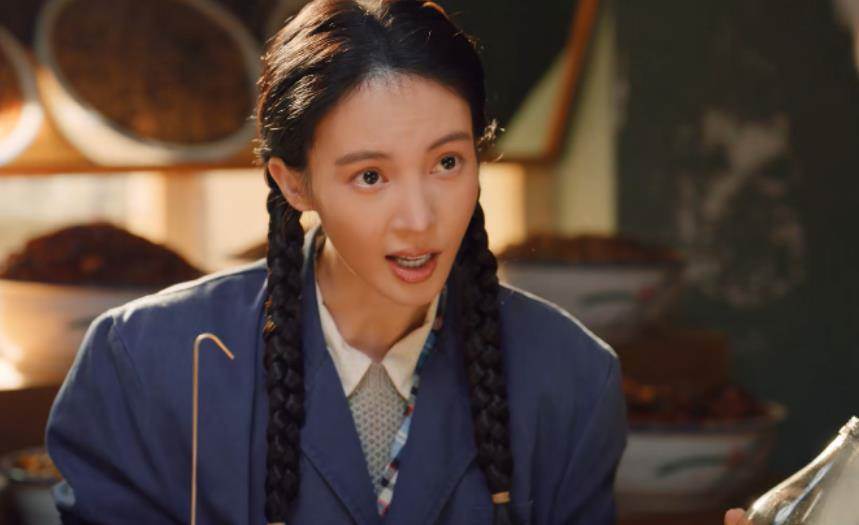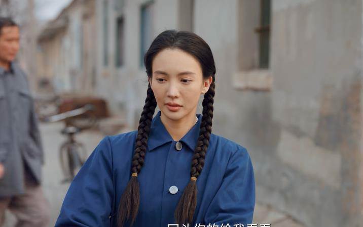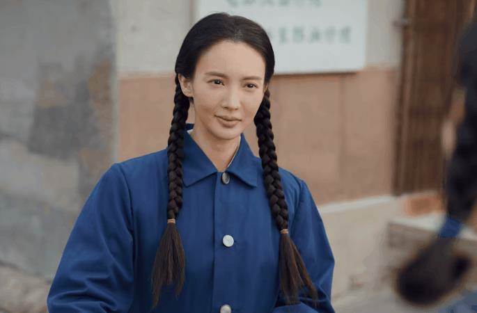 身穿一身藍色的制服,再搭配上兩捆特別粗的麻花辮,造型是土里土氣了,但是臉確實讓人出戲。
