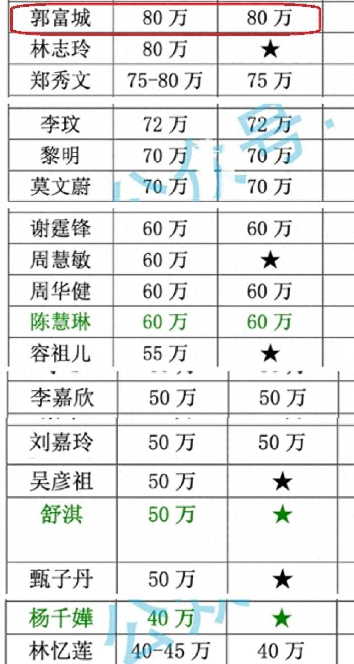 這個價位的港星出場費由高到低分別是郭富城、鄭秀文、李玟、黎明、莫文蔚、謝霆鋒、周慧敏、陳慧琳、容祖兒、李嘉欣、劉嘉玲、吳彥祖、甄子丹、梁詠琪、關之琳、楊千嬅、林憶蓮、葉倩文,只有郭富城到80萬。