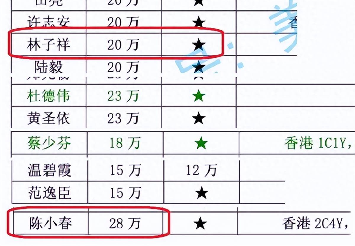 比較「便宜」的大咖明星還有陳小春、趙雅芝、陳慧嫻、蔡少芬、溫碧霞,分別是28萬、25萬、20萬、18萬、15萬。他們都是有現象級爆款代表作的明星,而且不少人還以高顏值聞名,但相較之下出場費挺接地氣的。