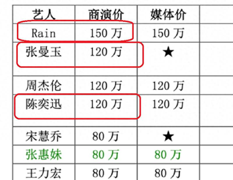 當然,這份報價表還缺劉德華、張學友、成龍、梁朝偉等大咖港星,這幾位中,除了成龍,其他三位幾乎是不跑商演的,否則報價應該能超過Rain。
