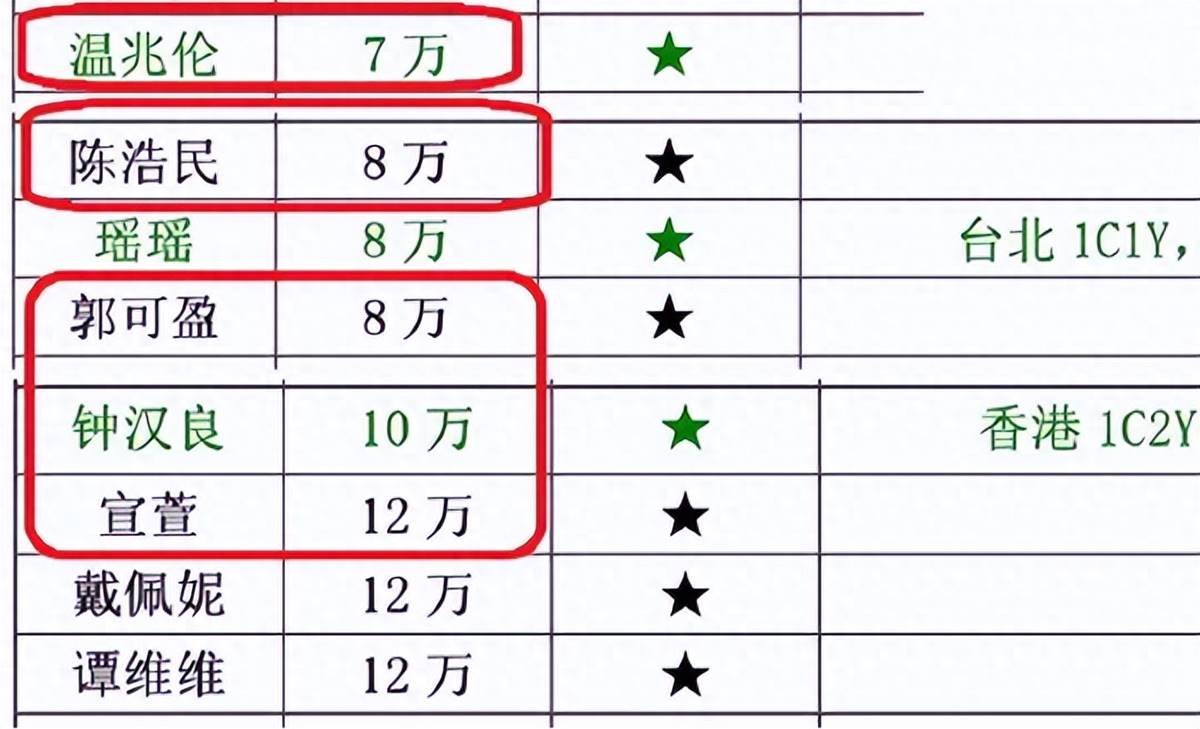 讓人萬萬沒想到的是,出場費最低的是溫兆倫,只有7萬,其他比較低的還有郭可盈、陳浩民和鍾漢良,分別是8萬、8萬和10萬,連宣萱都比不上。