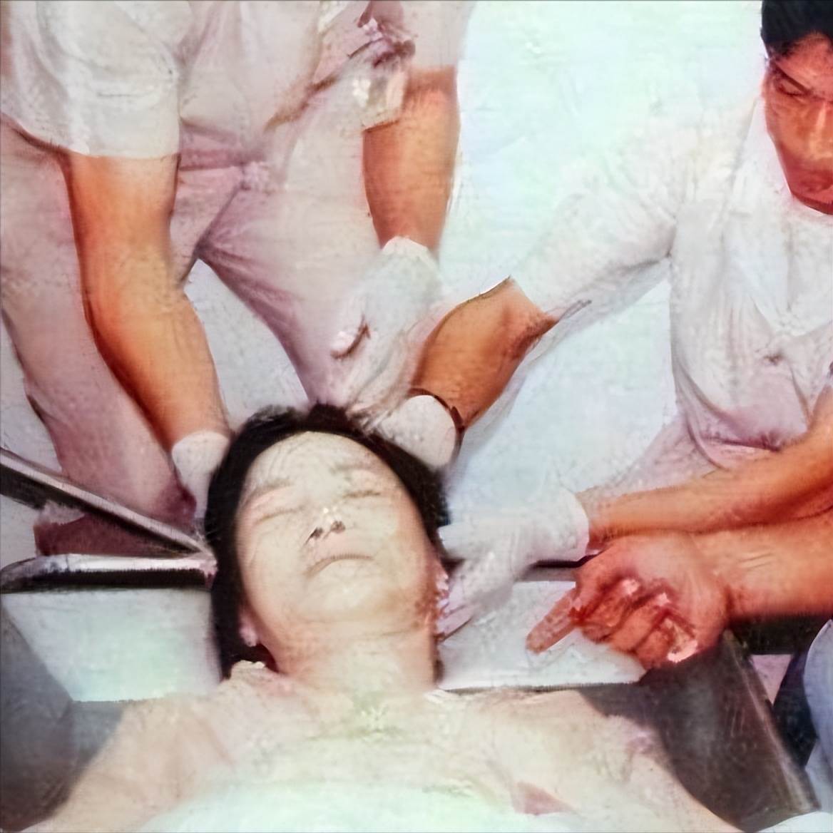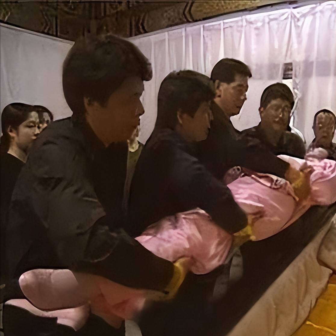 這是鄧麗君葬禮上的真實照片,她穿著生前最愛的桃紅色旗袍,被小心翼翼地抬進了水晶棺。