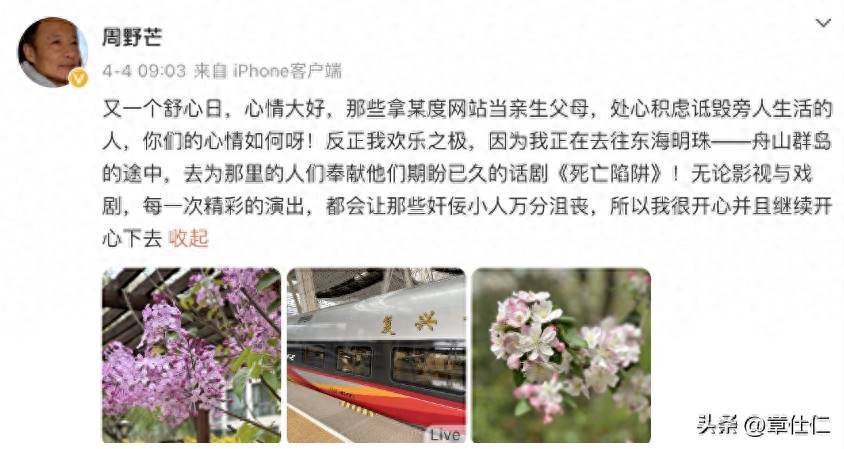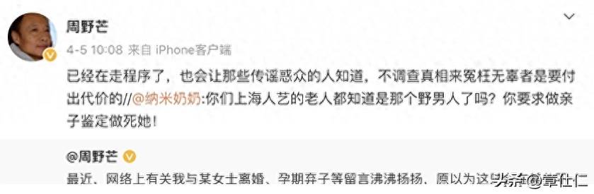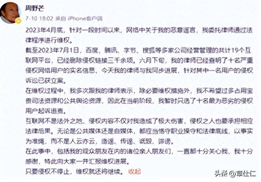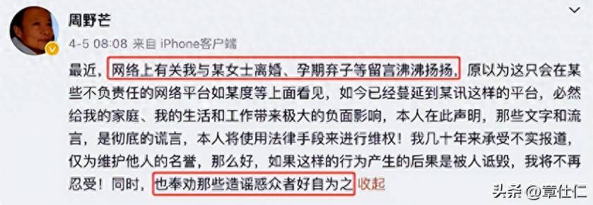 今年7月份,周野芒在社交平台再次發聲,要嚴肅追究造謠者,幾十年來,他深受負面影響的傷害,都只是為了孩子隱忍不發。