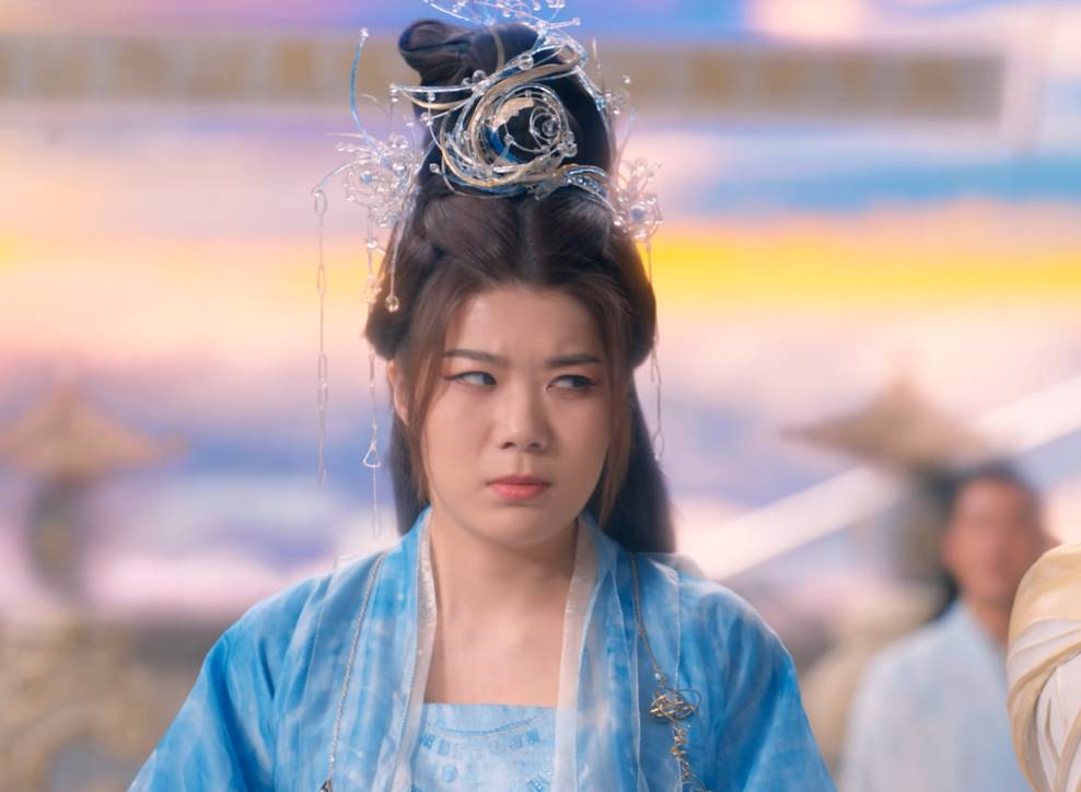 劇中,楊笠身穿深藍色的古裝,頭上頂著塑料質感的發飾,放在別的演員身上,這一套再不濟也能穿出仙姑的感覺。