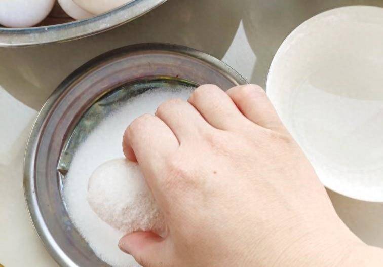 1、鴨蛋洗凈晾干,用鹽水和白醋浸泡一會兒,用鋼絲球慢慢擦洗干凈,這一步非常重要,因為只有干凈的雞蛋才能保證腌出來的鴨蛋口感好。