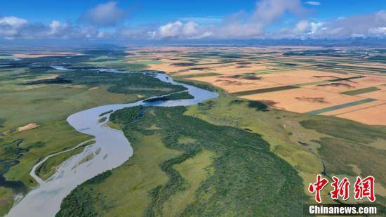 又是一年麥穗黃,風吹麥浪遍地香。立秋時節,新疆伊犁州昭蘇縣46.9萬余畝小麥進入成熟期,即將進行收割。圖為河流流經整齊麥田旁。昭蘇縣融媒體中心 供圖