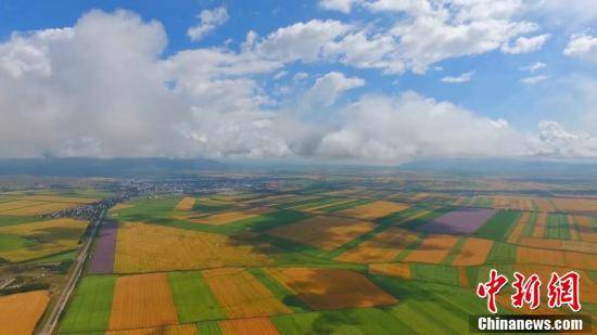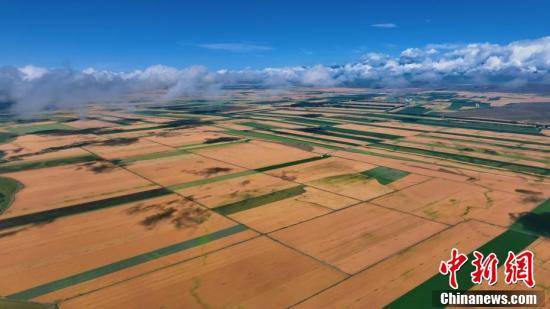 一望無際的麥田里,麥浪翻滾。俯瞰廣袤田野,黃綠相間,在藍天白云的映襯下,一幅豐收畫卷盡收眼底。圖為鳥瞰麥田「豐」景如畫。昭蘇縣融媒體中心 供圖