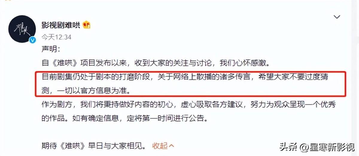 眼見網友吵得不可開交,《難哄》的劇方火速發文辟謠,直言項目還在籌備中,網傳為不實信息!也是讓這部劇的選角,看起來更加撲朔迷離!